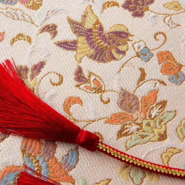 純和風の高級金襴を芳名帳へと大胆アレンジ!製本用に作られたものではなく高品質な京都西陣の生地を採用しています。優しく淡いベージュ地に、かわいいおしどりの柄をパステルトーンで織り込みました。キラリと光る金箔がきれいです。