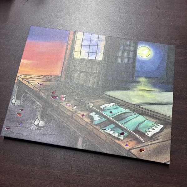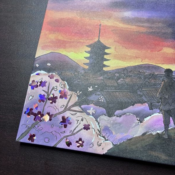 左側にはホログラム加工の桜をあしらい、光の角度によってきらめく華やかさを添えています。静かな景色の中に、散りゆく美しさと儚さを重ねたデザインです。
