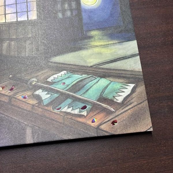 そばに散る桜は、表紙と同じくホログラムピンクで統一し、表裏で世界観がつながるようデザインしています。武士の気高さと、散り際の美を感じさせる、余韻ある一面です。
