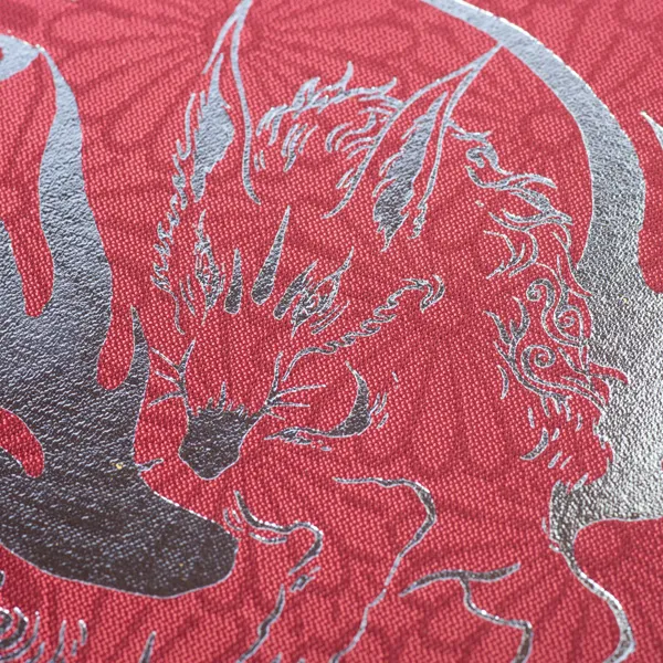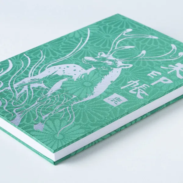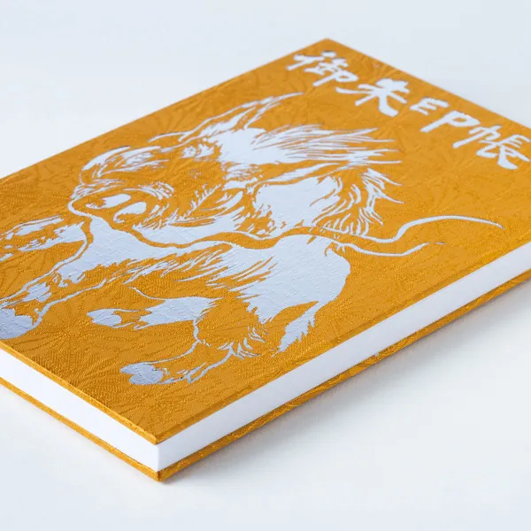 神の眷属、御先神とも考えられているその神使を箔押しでゴージャスに表現してみました。表紙の布クロスには菊の紋様があり、日本の花、天皇を象徴する菊に神の使いが演出されています、当社得意の箔押しで作った高級感あふれる仕上がりになっています。
