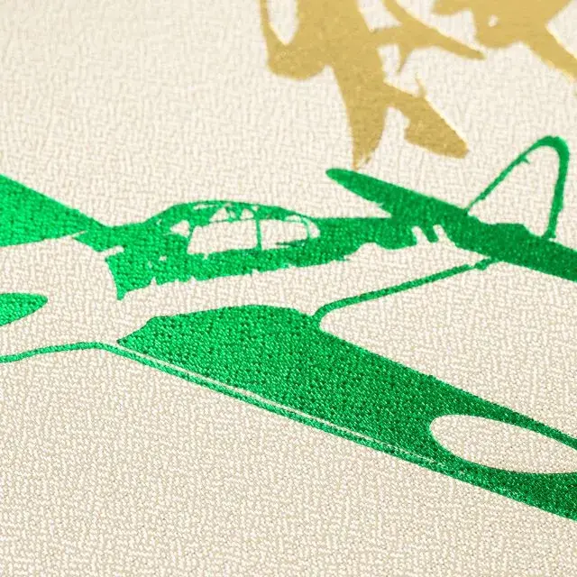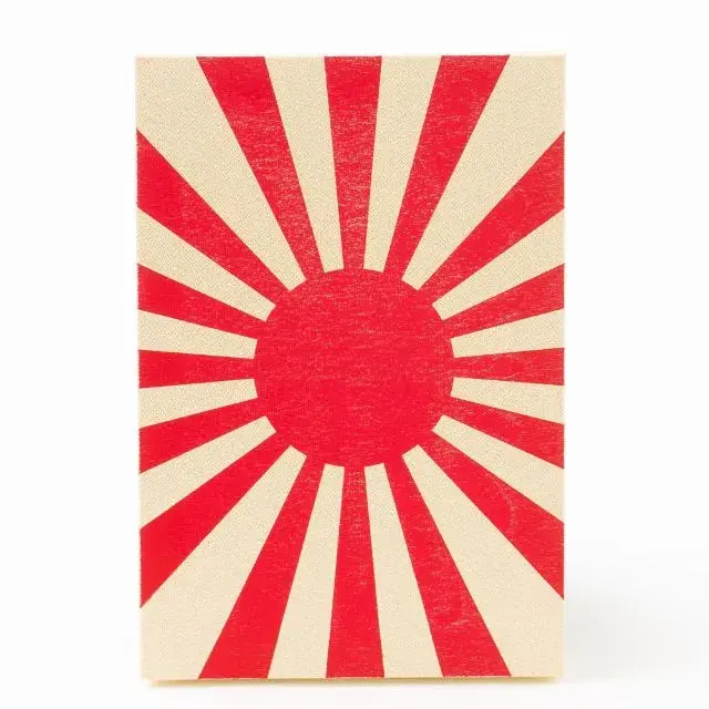 金・緑・赤と様々なバリエーション箔を使用した箔押し御朱印帳。特に赤は艶無しの「朱」に近い色で打ち込みました。色味としては日の丸の赤の色を忠実に再現する事ができました。旭日旗も同色を使用しておりパンチの利いた粋な風合いになっています。