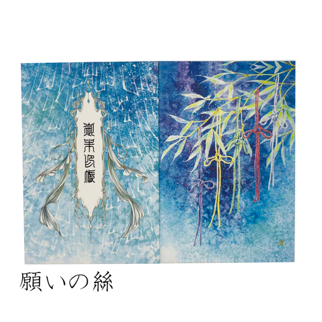 七夕と星空をテーマに描いた作品です。古来の七夕のお祭りでは、短冊ではなく、願いを込めて糸を結んでいたそうです。爽やかで涼しい夏の夜を、イメージしてデザインしてみました。