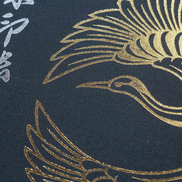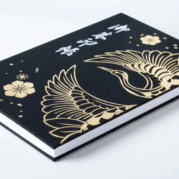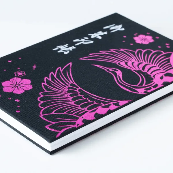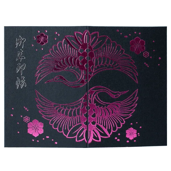大胆に目いっぱいの大柄の鶴、まさに鶴王。表裏一体のデザインでインパクトのある仕上がりに作ってみました。表紙には黒地のクロスとピンクのクロス、箔の色は金箔と珍しいピンク色の箔を使ったカラーバリエーションになります。